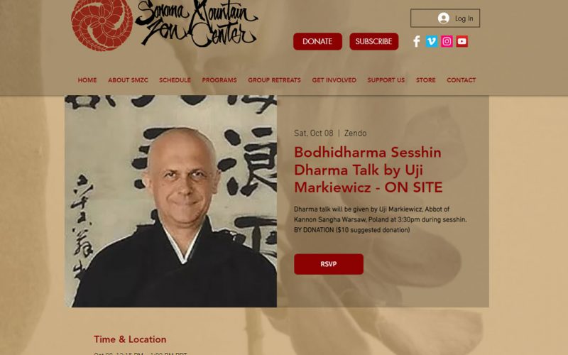 Na zaproszenie naszej rdzennej świątyni Genjo-ji w Sonomie w Kalifornii 8 października (w sobotę) mistrz zen i opat Buddyjskiej Wspólnoty Zen Kannon Mikołaj Udżi Markiewicz wygłosi Mowę Dharmy.